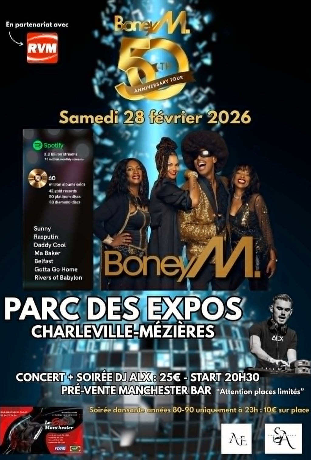 Evenement, Pour ses 50 ans de scène, Boney M sera présent en concert live Au Parc des Expositions de Charleville-Mézières .