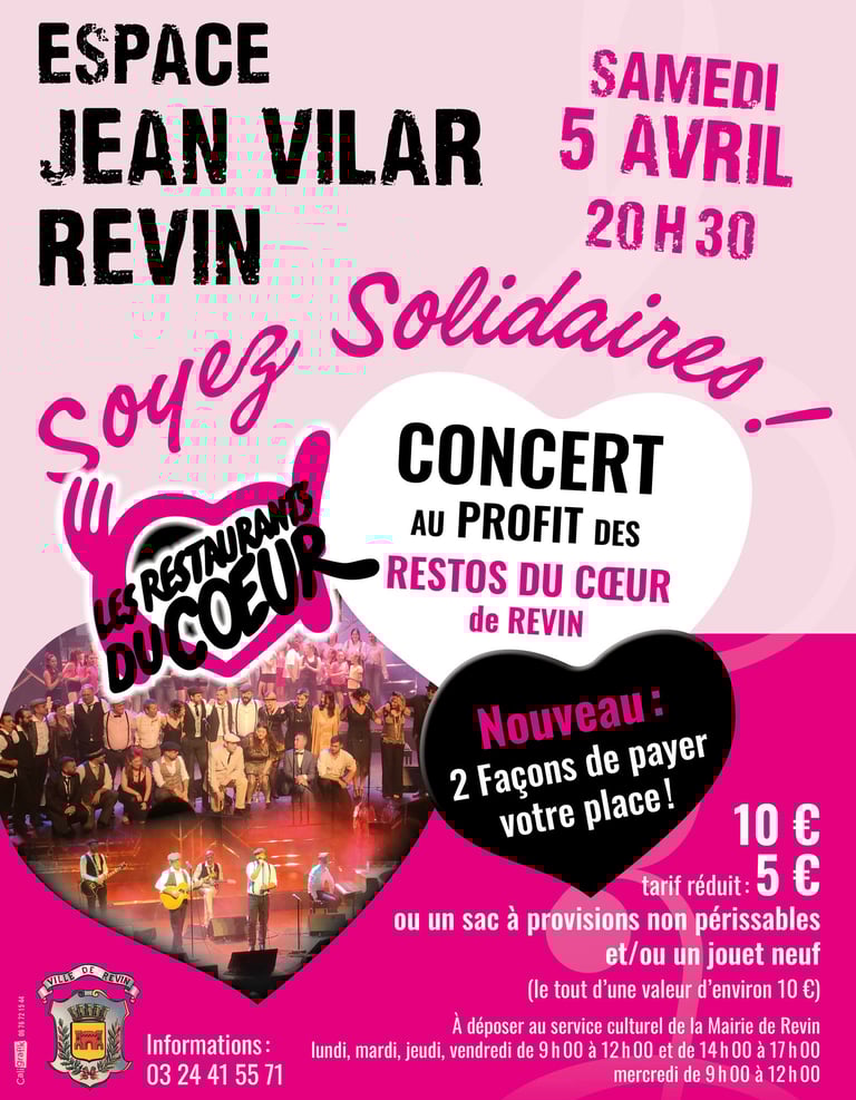 Pour participer, vous pouvez choisir de payer votre place ou de faire un don : un sac de provisions non périssables et/ou un jouet neuf en faveur des Restos du Cœur. Ces dons peuvent être déposés au service culturel de la Mairie de Revin pendant les heures d'ouverture :